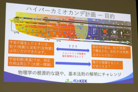 陽子崩壊と、ニュートリノと反ニュートリノの振る舞いの違い(CP対称性の破れ)を解明して「なぜ宇宙には物質が存在し、反物質がほとんど存在しないのか」という現代物理学最大の謎の一つに挑む。