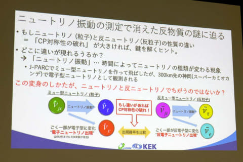実験の大枠はこうだ。まず、茨城県東海村のJ-PARCの加速器で人工ニュートリノビームを生成する。そのニュートリノを295km離れた岐阜県飛騨市神岡町の「ハイパーカミオカンデ検出器(超大型水チェレンコフ装置)」で観測する。その飛行過程では「ニュートリノ振動(時間によってニュートリノの種類が変化する現象)」が発生する。そのニュートリノ振動を詳細に観測することで、「消えた反物質」の謎に迫る。