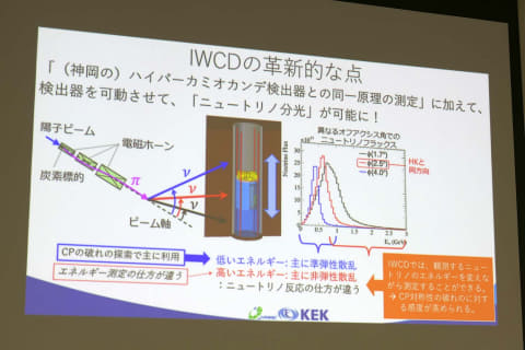 「CP対称性の破れ」の検証には、主に低いエネルギー(600MeVくらい)のニュートリノが用いられる。これまで非弾性散乱から生まれる高いエネルギー(1,000MeVくらい)のニュートリノが検出に混ざってしまっていたが、IWCDを使うことで、それを区別して、より高精度な検出・推定に用いることができるようになる。この中間検出器の導入により、従来手法では10年程度は必要だと想定されている「CP対称性の破れ」の確認が、約半分の5年程度の短期間で可能になると期待されている。