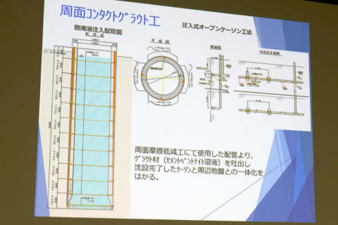 工法は「圧入式オープンケーソン工法」。コンクリートのケーソンを打ち込んでいき、内部の土を掘っていく方法だ。建設地は近隣に住宅や畑がある。そのため可能なかぎり周辺環境への影響を少なくすることや、経済性から選ばれた。地下水を汲み上げる必要がないことも利点だ。
