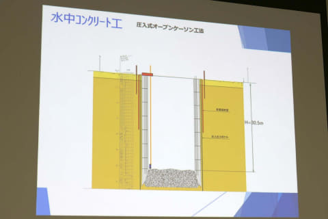 打設が終わって底蓋をしたら、水を徐々に抜いていきながら壁の点検を行なっていき完了となる。水を入れているあいだは周辺地盤、浮力や地下水とのバランスが取れているが、最後には水を抜くので、そこが一番重要な作業となる。