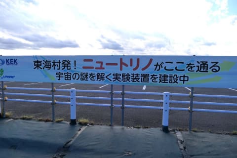 建設現場すぐの道路脇付近には「東海村発! ニュートリノがここを通る 宇宙の謎を解く実験装置を建設中」という看板が設置されている。