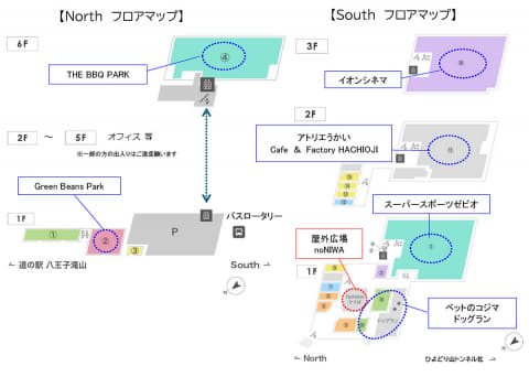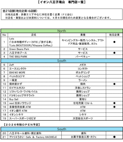 主な出店店舗は、映画館「イオンシネマ」、キャンピングカー販売/レンタル・アウトドア用品・雑貨販売・カフェ「Lots」、スポーツ「スーパースポーツゼビオ」、ペットショップ「ペットのコジマ」、ボルダリング「ISHI NO MORI」、バーベキュー「THE BBQ PARK」、お菓子製造工房・カフェ「アトリエうかい Cafe & Factory HACHIOJI」など。