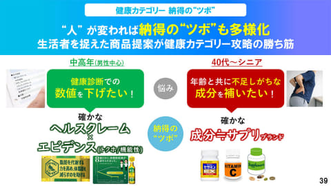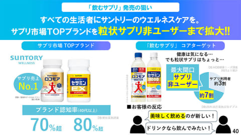 こういったニーズがある市場において、サントリーウエルネスでは「ロコモア」「セサミン」のサプリブランドを展開しており、40代以上のブランド認知率はロコモアが70%、セサミンが80%を超えている。