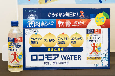 ロコモアWATERは、軟骨由来成分であるコンドロイチン硫酸、筋肉由来成分であるアンセリン、アミノ糖のグルコサミン塩酸塩、ポリフェノールのケルセチン配糖体の4成分を配合。ややクセのあるサプリ原料をサントリーの創味技術で、スポーツなどアクティブなシーンでの水分補給にも適した、すっきりとしたレモン味に仕上げた。