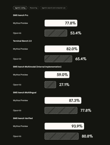 そのため、Anthropicは新モデルとなるMythos Previewをプロジェクト・グラスウィングのメンバーにのみ提供し、一般公開は行なわない。様々なベンチマークでもOpus 4.6を大幅に上回っている。