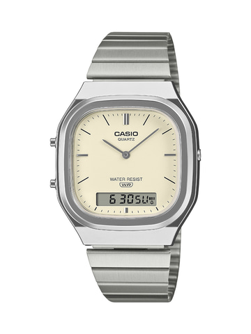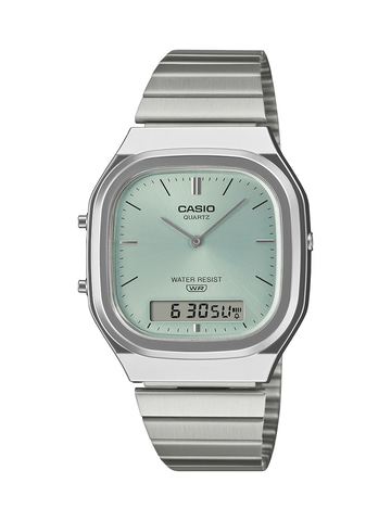「AQ-240E」はレトロモダンなデザインのアナログ・デジタルコンビネーションモデル。角型フェイスを基本にしながら、丸みのあるケース形状を採用。質感やカラーが印象的な、広めのダイヤルも特徴になっている。