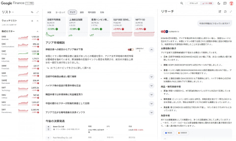 すでに米国とインドで提供しているGoogle Financeを再構築したもので、市場や個別銘柄について自然文で質問できるAI駆動の調査機能を備え、関連リンク付きの回答を表示する。