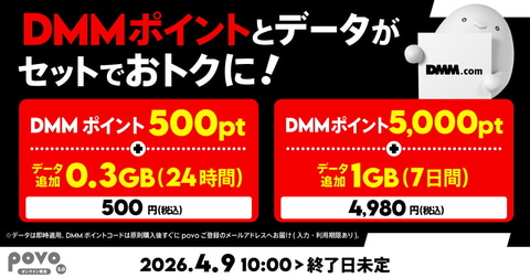KDDIは、povo2.0 の「コラボのトッピング」として、DMMポイントとデータがセットになったトッピング2種類の提供を開始した。4月9日からスタートしており、提供終了日は未定。