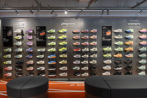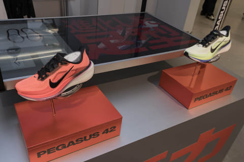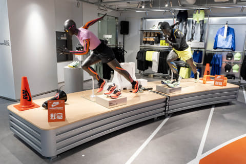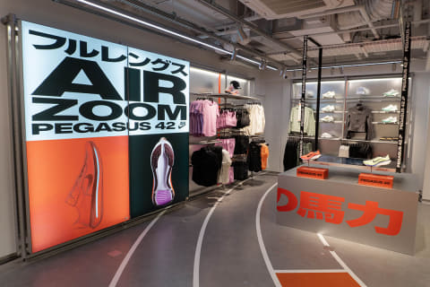2階のランニング / トレーニングのフロアは、疾走感のあるマネキンを展示。床はトラックを模したデザインとした。ランニングに関しては、4月9日に発売されたばかりの「ペガサス 42」をメインに打ち出している。