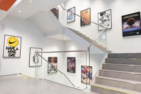 階段の壁面には、それぞれのフロアに関わりのあるカテゴリーの、過去のコマーシャルなどのポスターを展示している。