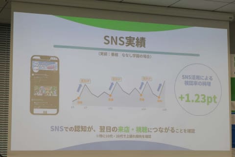 同社によると、ファミリーマート限定のコンテンツを制作することは来店客の増加につながっているという。VTuber「ななしいんく」のタレントが出演するFamilyMartVision限定番組「ななし学園」の放映では、SNSで放映を告知すると翌日に来店客が増加するというデータが得られた。特に10代・20代で上振れ傾向にあることも確認されている。AIカメラを利用したFamilyMartVisionの視認率においても、SNS告知の翌日は視認率が向上するという。