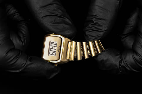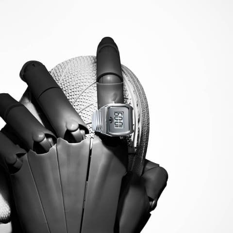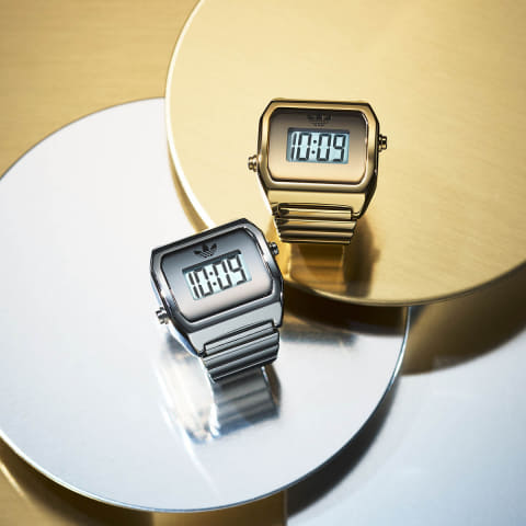 80年代のレトロなデジタルウォッチの雰囲気を持つアディダス オリジナルス「デジタル ツー」をベースに開発。無駄を排したミニマルなデザイン、エッジーなフォルムにより強調されるメタルの質感を特徴としている。