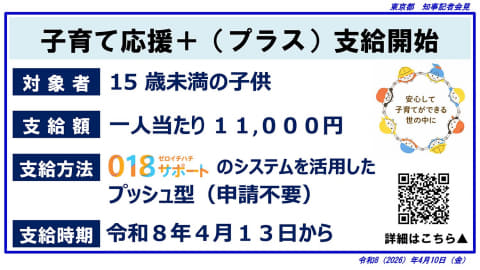 東京都は、子育て支援として、15歳未満の子どもに11,000円を1回支給する「子育て応援+(プラス)」を開始する。