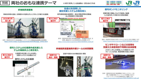 JR東日本では、架線支持物の塗装、支障樹木の伐採などを人に代わって作業できる、人間の上半身を模した人型重機を3月に導入。今後は、信号通信設備の故障時に、過去の類似事象を自動抽出し原因推定と対策を提案する、生成AIを活用した復旧支援システムを相互導入するほか、センサーやドローンなどの活用を見据えた検査項目、検査周期の見直しなども共同で検討していく。