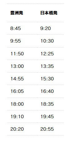 航路は豊洲船着場(アーバンドックららぽーと豊洲)~日本橋船着場(中央区防災船着場)で、片路約25分。豊洲発、日本橋発それぞれ1日9便で、毎日運航する。ただし、4月30日、5月7日、5月13日、5月14日、5月21日、5月27日、5月28日を除く。