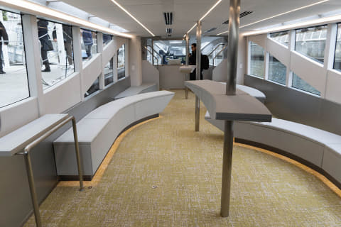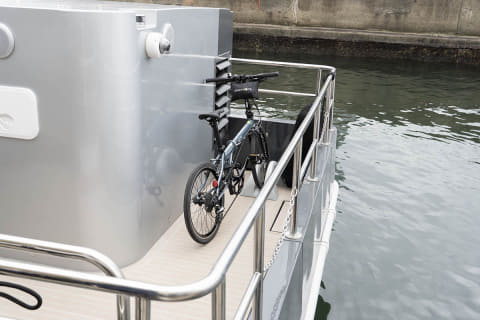 Nihonbashi e-LINERは自転車ごとの乗船やベビーカー、車椅子の乗船にも対応。レジャーのほか通勤や買い物など日常での利用も想定し、船内には高さの異なるシート、船内で仕事をする人に向けたテーブルや、フリーWi-Fi、コンセントを装備する。また、緊急物資の水上輸送、傷病人の移送や緊急搬送など、有事対応も想定している。