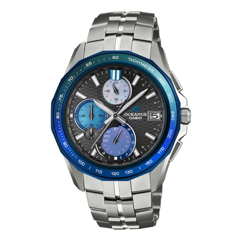 OCW-S7000APは「Manta S7000」シリーズのBluetooth電波ソーラーモデル。タキメータースケールが印字されるサファイアガラス製ベゼルには、ブルーのグラデーション蒸着が施されている。