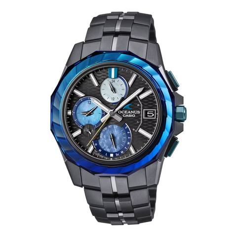 OCW-S6000APは「Manta S6000」シリーズのBluetooth電波ソーラーモデル。サファイアガラス製ベゼルにはスパイラルカットが施されるほか、ケースとバンドはブルーのAIP(アークイオンプレーティング)処理になっている。