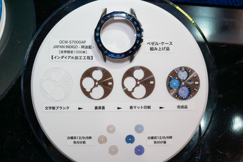 古来から受け継がれる天然藍の「阿波藍」(あわあい)を伝統的な製法で染料化し、顔料を調色。これを白蝶貝でできた3つのサブダイヤルの染色に用いており、濃淡で海の広がりを表現した。ダイヤルはブラックで、波をイメージした模様が光の反射で浮かび上がる仕上げになっている。
