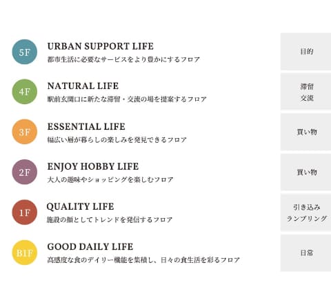 59店舗が出店予定で、地下1階にはスーパーマーケット「明治屋 自由が丘ストアー」、ドラッグ&コスメ「マツモトキヨシ」がオープン。