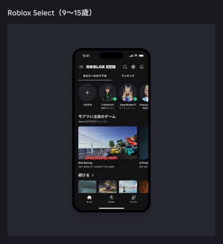 9歳~15歳向けは、同社の統一年齢確認システムによる判定、もしくは保護者が確認するとRoblox Selectアカウントとなる。デフォルトの通信設定は変更されない。