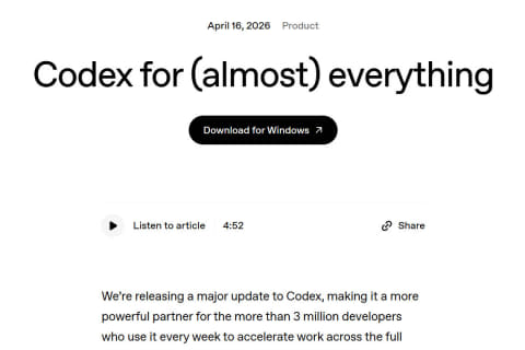 OpenAIは16日(米国時間)、コーディングエージェント「Codex」の大規模アップデートを開始した。これまでの「コーディング」だけでなく、computer use(コンピューター操作)や画像生成に対応し、より広範な開発作業を可能とする。