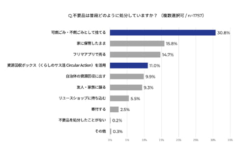 一方で、不要品の処分方法としては依然としてごみとして廃棄しているケースも多く、また、衣類・ファッション雑貨に加え、趣味・コレクション品、小型家電・電子機器類など、多様な品目が家庭内に不要品として滞留している実態も確認された。