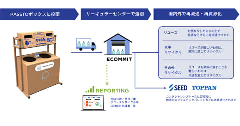 コンタクトレンズケースは、使い捨てコンタクトレンズの包装容器のプラ容器部分を指す。TOPPANおよびシードと連携し、純度の高いポリプロピレン(PP)を回収し、物流現場で使用される資材へと再生する。