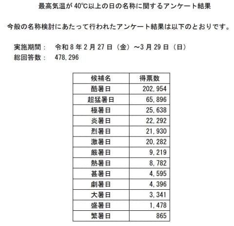 アンケートの総回答数は478,296で、そのうち「酷暑日」の得票数は202,954。以下、超猛暑日が65,896、極残暑が25,638などと続いている。