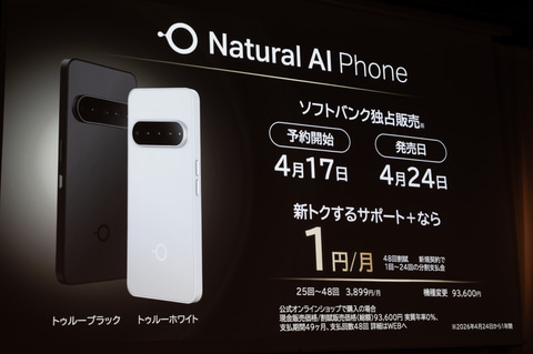 ソフトバンクは、OSレベルでAIエージェントを搭載した、米Brain Technologies製のスマートフォン「Natural AI Phone」を4月24日に発売する。日本で1年間はソフトバンクの独占販売。価格は93,600円。48回払いの割賦は24回目まで毎月1円など各種の購入支援策の対象。AIサービスの利用に料金はかからない。