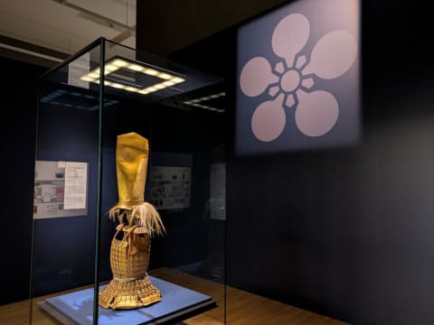会場に入ると、まず正対するのが鮮やかな金色の甲冑《金小札白糸素懸威胴丸具足》。