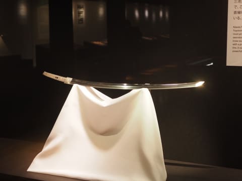 ここで最も注目を集めるだろう太刀が《銘 光世作》。「名物 大典太(おおでんた)」という通称でよく知られる、12世紀の平安時代に三池光世により作られた、伝説的なひと振り。室町時代には足利将軍家に伝わり、足利義昭から豊臣秀吉、そして前田利家へと渡ったとされている。