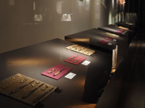 そのほか、前述した国宝の《茶皺韋包糸巻太刀(ちゃしぼかわつつみいとまきのたち)》をはじめ、刀装もいくつか展示されていた。さらに、刀装を飾る金具の制作者として有名な、後藤祐乗(ゆうじょう)をはじめとする、後藤家の作品がファイリングされた《後藤家歴代装剣小道具》などは、よく知る人ならば、展示ケースに張り付いて離れられなくなるだろう。いや、よく知らない筆者もその精緻な細工に驚き、離れられなくなった