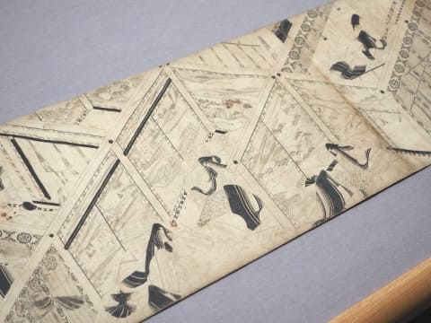古書跡ばかりでなく、絵巻もいくつか展示されている。その中で筆者がムムムと唸ったのが、鎌倉時代に描かれた《豊明絵草紙(とよのあかりえぞうし)》。その一部しか展示されていないが、この絵草紙は「最愛の妻をなくしたエリートの公家が、世俗の栄華を捨てて、妻の菩提を弔うために出家する」というストーリーだという。墨線のみで描く、一見すると「下書きかな?」と思ってしまう「白描画」というもの。これが、ものすごい緻密さで情景が描かれているのだ。しばし見入ってしまった。