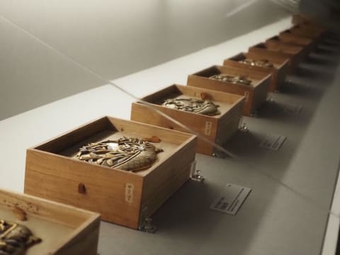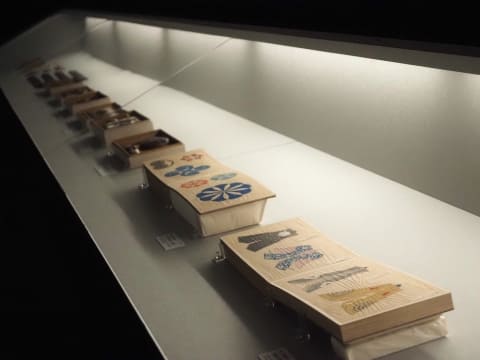 その文脈で、前田綱紀と彼が蒐集して分類したコレクションは、今展では広いスペースを使って展開されている。中でも見応えがあるのが《百工比照(ひゃっこうびしょう)》。工芸を対象とした実物資料および図案と技術見本をまとめ、木箱に収めたもの。展示室をぐるりと巡ると、息を呑むほどすばらしい、おそらく当時の最高水準の工芸品の数々が、引き出しのような箱に整然と納められている。まるで宝石箱のようだ。これらを見れば、加賀前田家が治めた現在の石川県において、今なお加賀友禅や輪島塗、金沢箔といった多彩な伝統工芸が盛んであることにも頷ける。