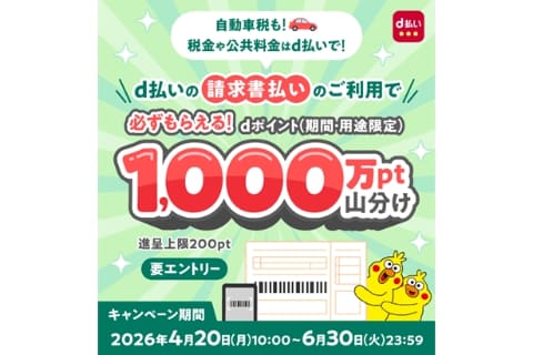 NTTドコモは、「d払い請求書払いのご利用で1,000万ポイント山分けキャンペーン」を開始した。6月30日までの期間中にキャンペーンサイトからエントリーし、「d払い」の請求書払いを利用したユーザーを対象に、dポイント(期間・用途限定)1,000万ポイントを山分けして進呈する。