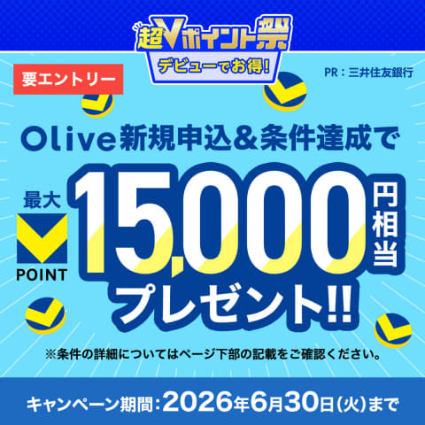 Oliveは、新規アカウント開設、キャンペーンエントリー、一度に10万円以上の入金の条件を満たすともれなく15,000ポイントを付与。さらにスマホのタッチ決済を1回以上利用すると5,000円分(ランクが一般の場合)の「VポイントPayギフト」をプレゼントする。対象は新たに三井住友銀行の口座を開設した人のみ。開催期間は4月30日まで。
