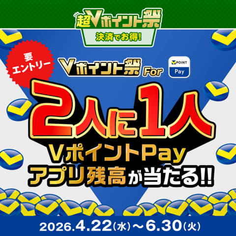 期間中にV会員番号でキャンペーンサイトからエントリーのうえ、VポイントPayアプリとV会員番号を連携し、各期間中にVポイントPayアプリで合計1,000円(税込)以上支払うと、2人に1人、VポイントPayアプリ残高が最大2,000円分当たる。1等は2,000円分(合計1,000名/各期間500名)、2等は200円分(合計10,000名/各期間5,000名)、3等は20円分(残りの当選人数)がもらえる。合計当選本数、3等の当選本数の仕組みはカード決済のキャンペーンと同様。