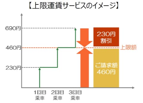 上限運賃サービスは、土日祝・年末年始(毎年12月29日~1月3日)に、札幌市電でクレカ乗車を利用した場合、利用当日の乗車運賃が累計で460円(2乗車分)に到達した時点で、それ以降の運賃は発生せず、自動的に460円で乗り放題となる。対象は大人運賃のみ。カード番号が同じでも、媒体(プラスチック製カード、スマートフォン、スマートウォッチ、リング型デバイス等)が異なる場合は、1日の乗車運賃として合算されない。