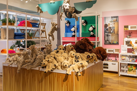 家具や生活・インテリア雑貨に加え、テイクアウト用のスウェーデンフード商品も用意。ラインナップは定期的に変更される。キッチンダイニングやリビングルームなど部屋ごとのエリアを設け、遊び心やインスピレーションを盛り込んで提案する。
