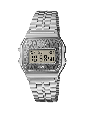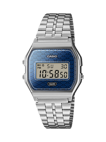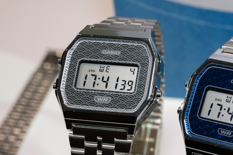 ロングセラーの「A158」をベースにした、山形カシオで製造するメイドインジャパンのモデル「A159」のカラーバリエーション。フェイスに、同心円の弧が重なって波のように見える、伝統的な吉祥柄の「青海波」(せいがいは)があしらわれているのが特徴。