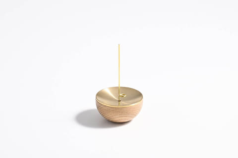 台座は、1つの調度品のような佇まいを目指し、温かみのある木製のベースに真ちゅう製の受け皿を重ねている。燃え落ちる灰を受け止めるのは、中央に向かって緩やかな傾斜を持つ金属パーツ。異素材が調和するミニマルなデザインは、どのような空間にも静かに馴染むとしている。
