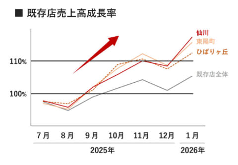 花小金井店では、生鮮・惣菜を中心とした売場面積の拡大やプロモーションの強化、2階フロアへの送客強化や九州ご当地メニューの提案、インストアサイネージの活用などに取り組んだ。その結果、業態転換後2カ月間(25年12月1日~26年1月31日)の実績として、前年同期比で売上高約42%増、客数約36%増と伸長した。