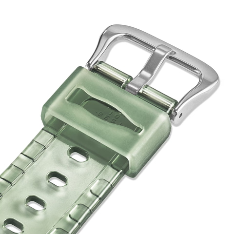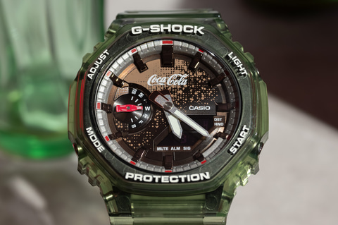 「コカ・コーラ」140周年を記念したコラボモデルは、人気のGA-2100シリーズがベース。ベゼルとバンドは、コカ・コーラの象徴的な瓶(コンツアーボトル)をイメージしたグリーンのクリアカラーで、ノスタルジックな雰囲気に仕上げた。曜日を示す9時位置の小針と遊環もボトルがモチーフで、遊び心あるデザインに仕上げられている。