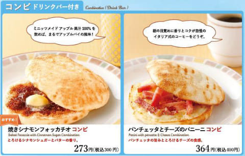 朝サイゼでは、ドリンクバー付きの焼きシナモンフォッカチオコンビ(300円)、パンチェッタとチーズのパニーニコンビ(400円)など、朝食限定メニューを手ごろな価格で提供する。