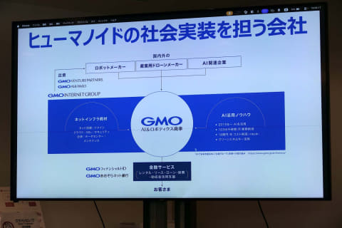 GMOインターネットグループにおいてAI・ロボット事業を担う商社であるGMO AIRの内田氏は、同社のビジネスモデルを紹介し、「AIロボティクスの技術革新は速い。いま産業革命の真っ只中にいる。2026年はヒューマノイド元年だと考えて取り組みを始めている」と述べ、ヒューマノイドの派遣サービスや、販売、渋谷の「ヒューマノイド・ラボ」、GMOの陸上部と共に取り組んでいる「GMOロボッツ」といった取り組みを紹介した。
