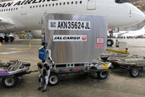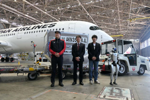 日本航空、JALグランドサービス、GMO AI&ロボティクス商事(GMO AIR)は27日、ヒューマノイドロボットによるグランドハンドリング業務の代替に向けた実証実験を5月から開始すると発表し、羽田空港のJALメインテナンスセンターで記者会見を行なった。