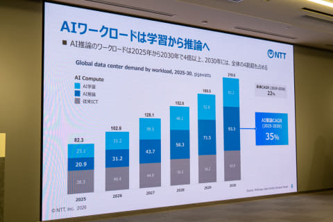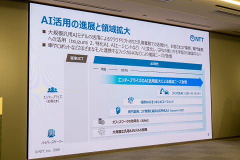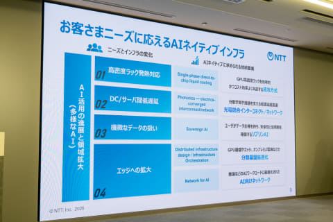 NTTは27日、AI活用の急速な拡大を背景に、AI活用の進展に合わせたリソース最適化・オペレーションを実現するAIネイティブインフラ「AIOWN」の展開を発表した。AIの用途に応じてGPUやネットワーク、電力などを最適に配分する次世代インフラとして推進する。