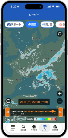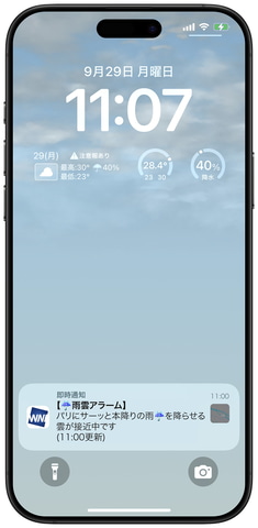 人気の機能である雨雲レーダーも全世界に対応。30時間先まで、10分間隔の雨雲予測を実現している。また、海外でも雨雲アラームを受け取れる。危険が迫る際には、位置情報に基づいたプッシュ通知も届く。
